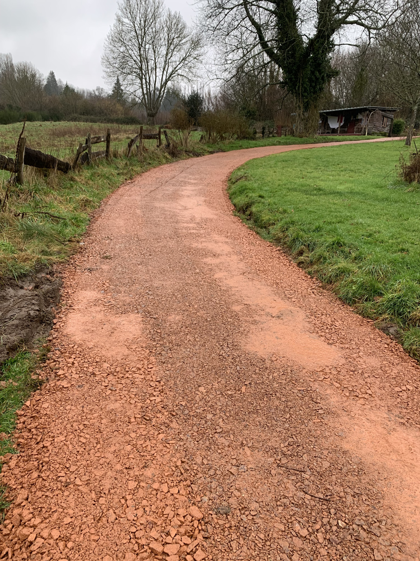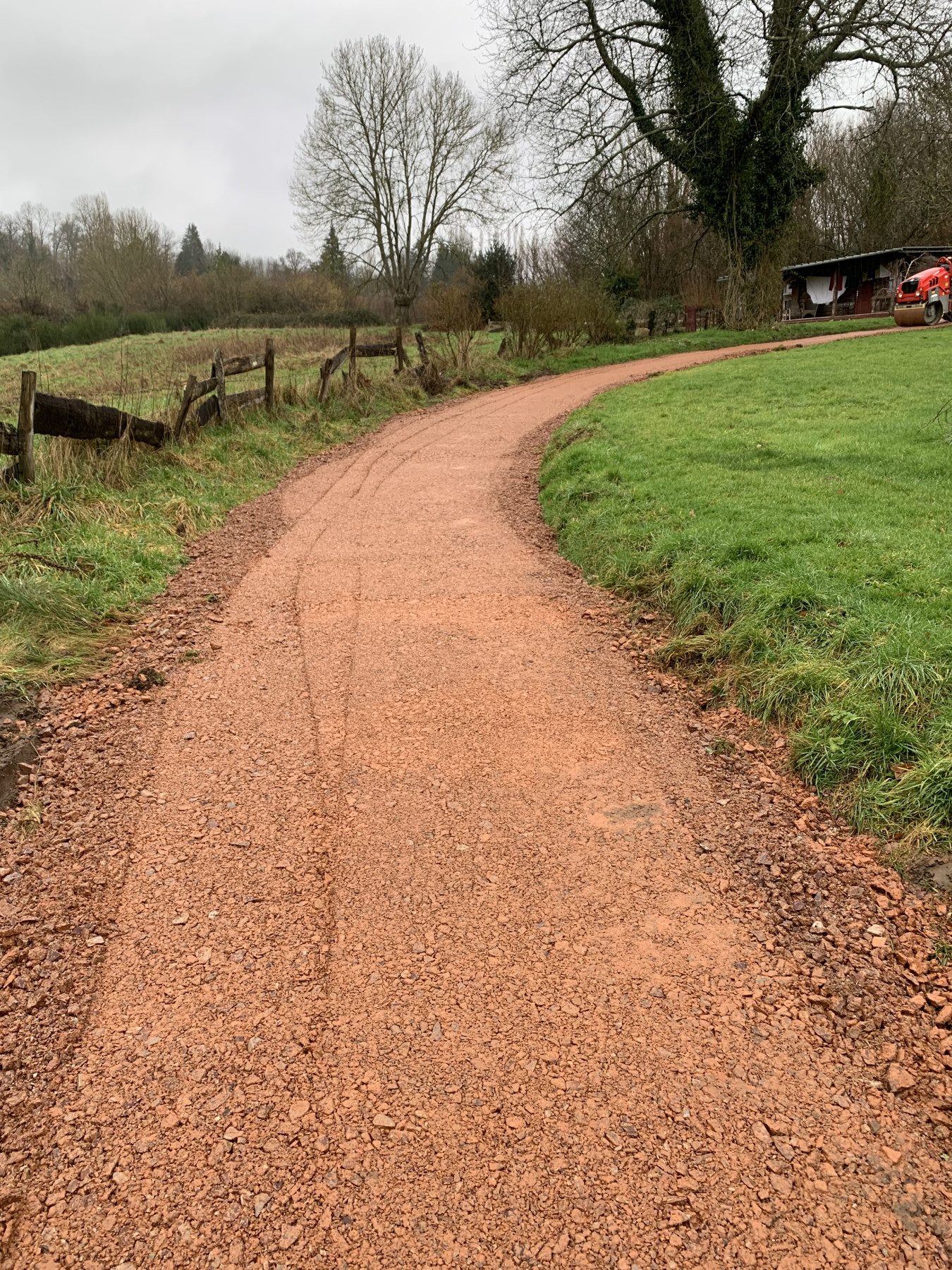 La mise en place du cailloux à été fait sur une dizaine de centimètres et à la suite le compactage a été réalisé par un rouleau compacteur.